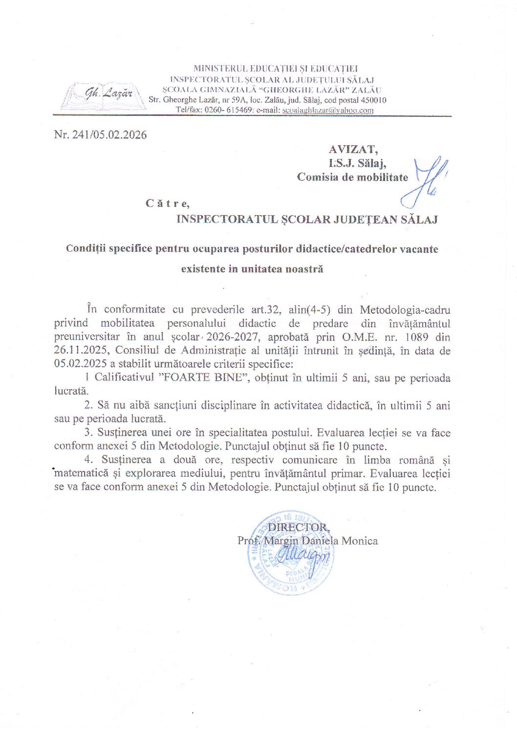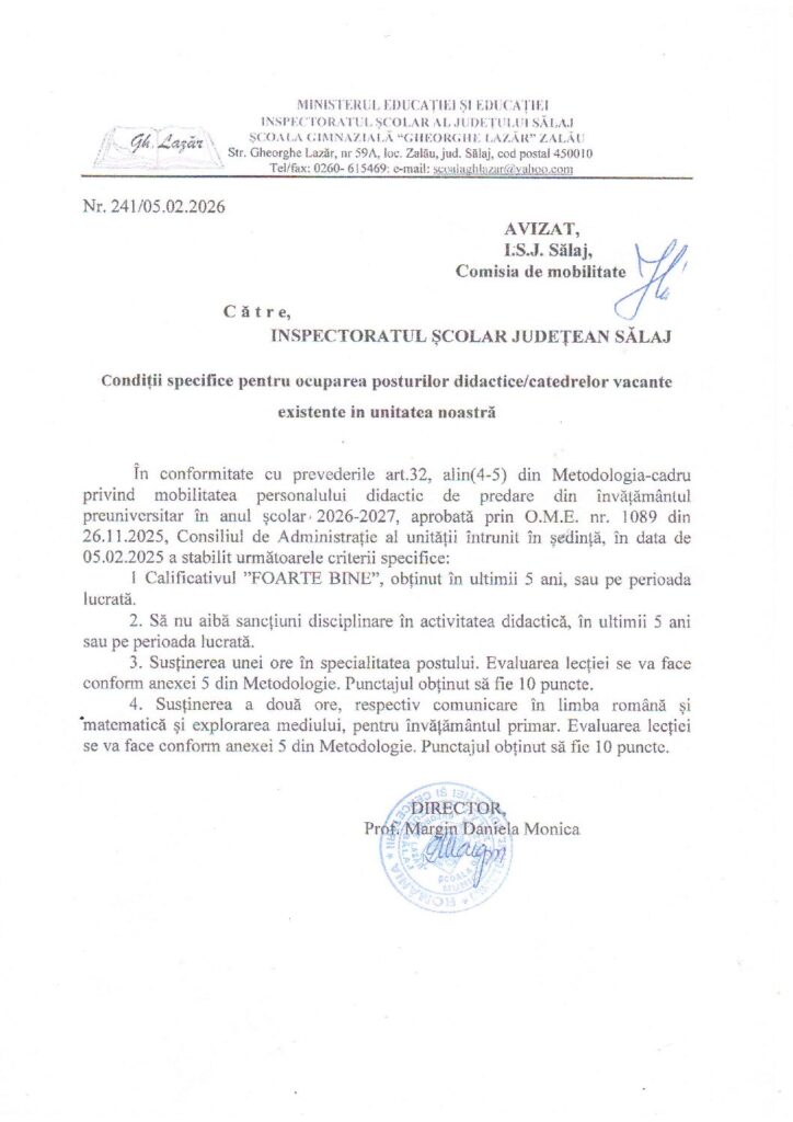 Condiții specifice pentru ocuparea posturilor didactice-catedrelor vacante existente în unitatea noastră